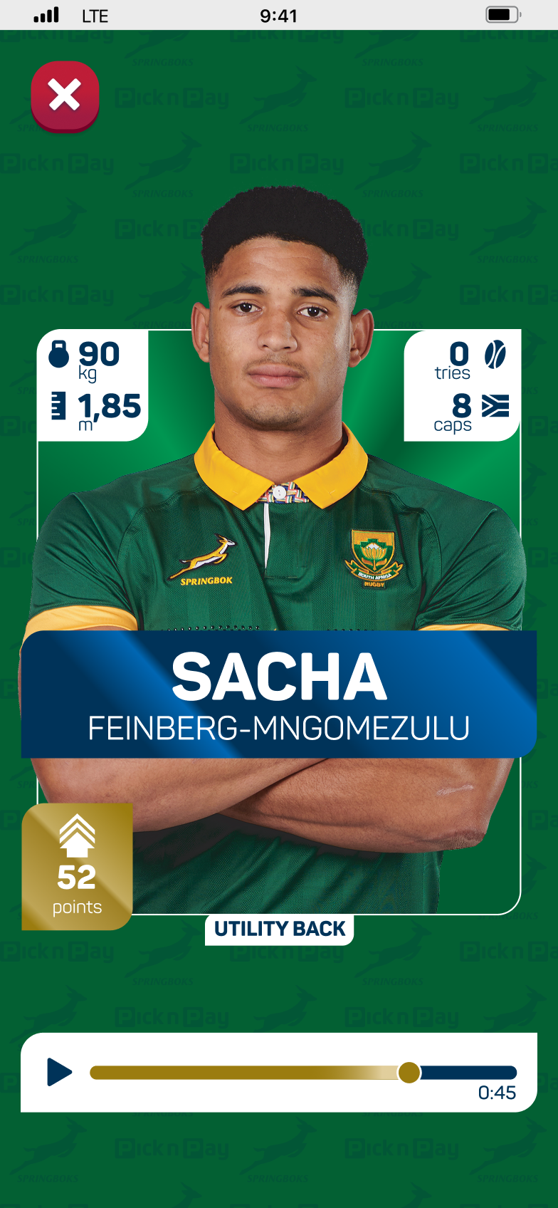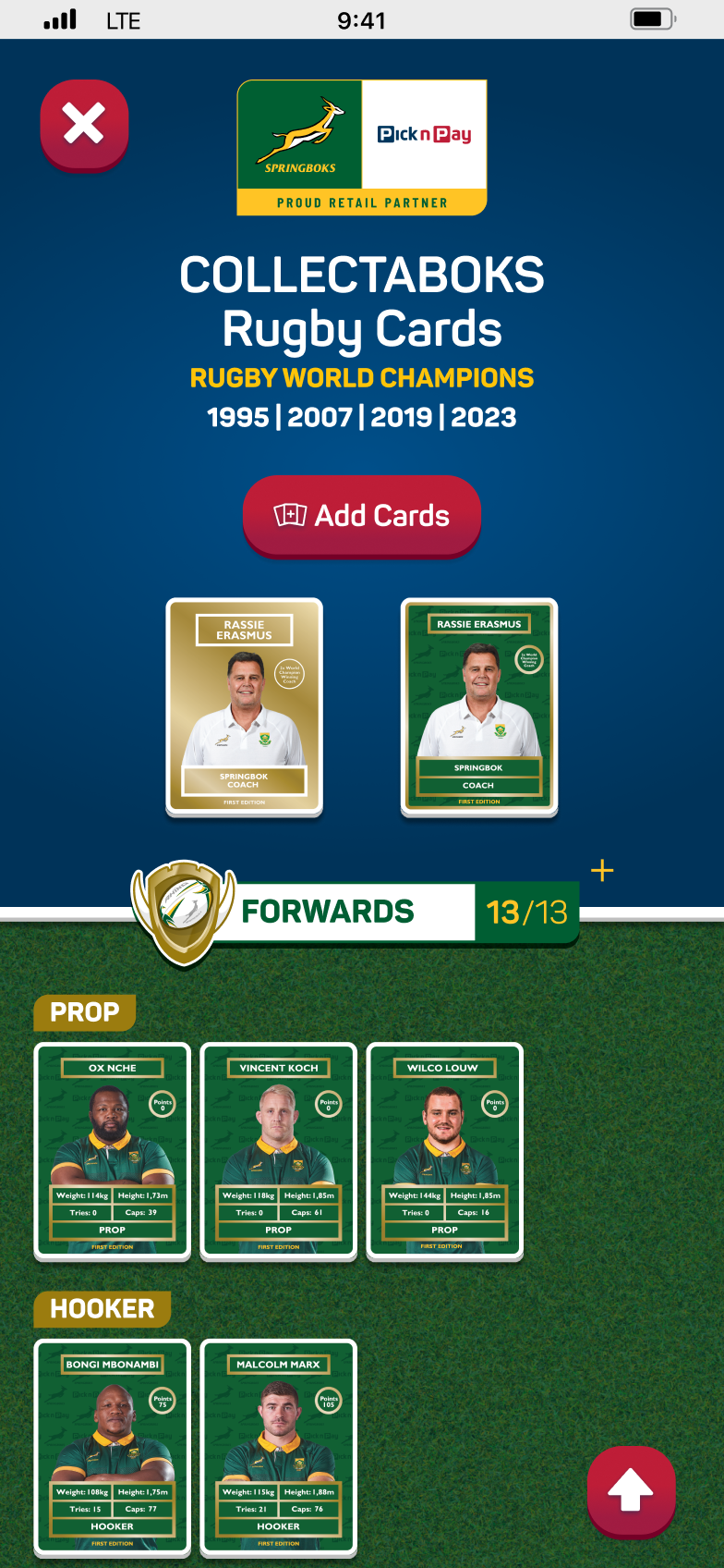 Sea Monster developed Collectaboks as a dual-layered gamified experience integrated directly into the Pick n Pay ASAP app, bridging physical retail with digital retention. The first layer transforms the physical card promotion into an interactive digital album. Users redeem unique codes from their in-store packs to unlock virtual collections featuring exclusive player stats and personal audio messages from Springbok stars.